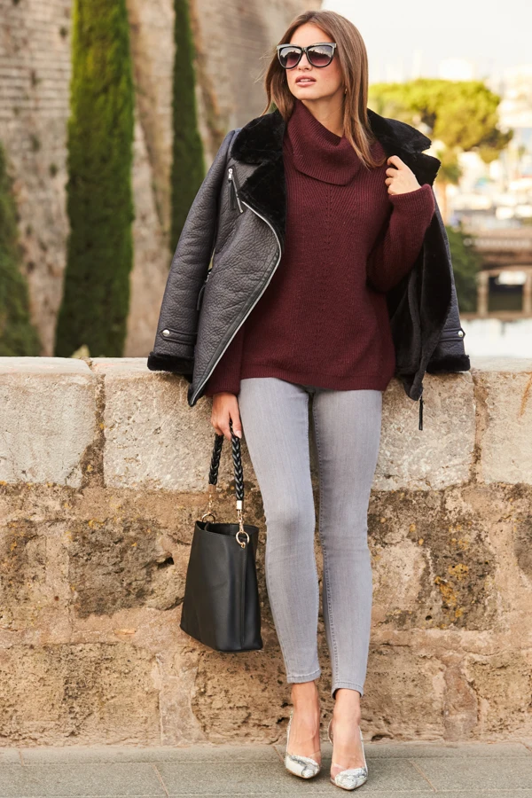 - Style with jeans, a rollneck and heels