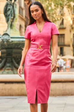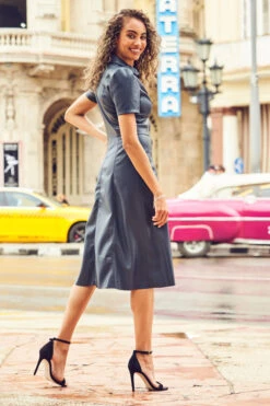 Navy Blue Faux Leather Short Sleeve Popper Front Shirt Dress